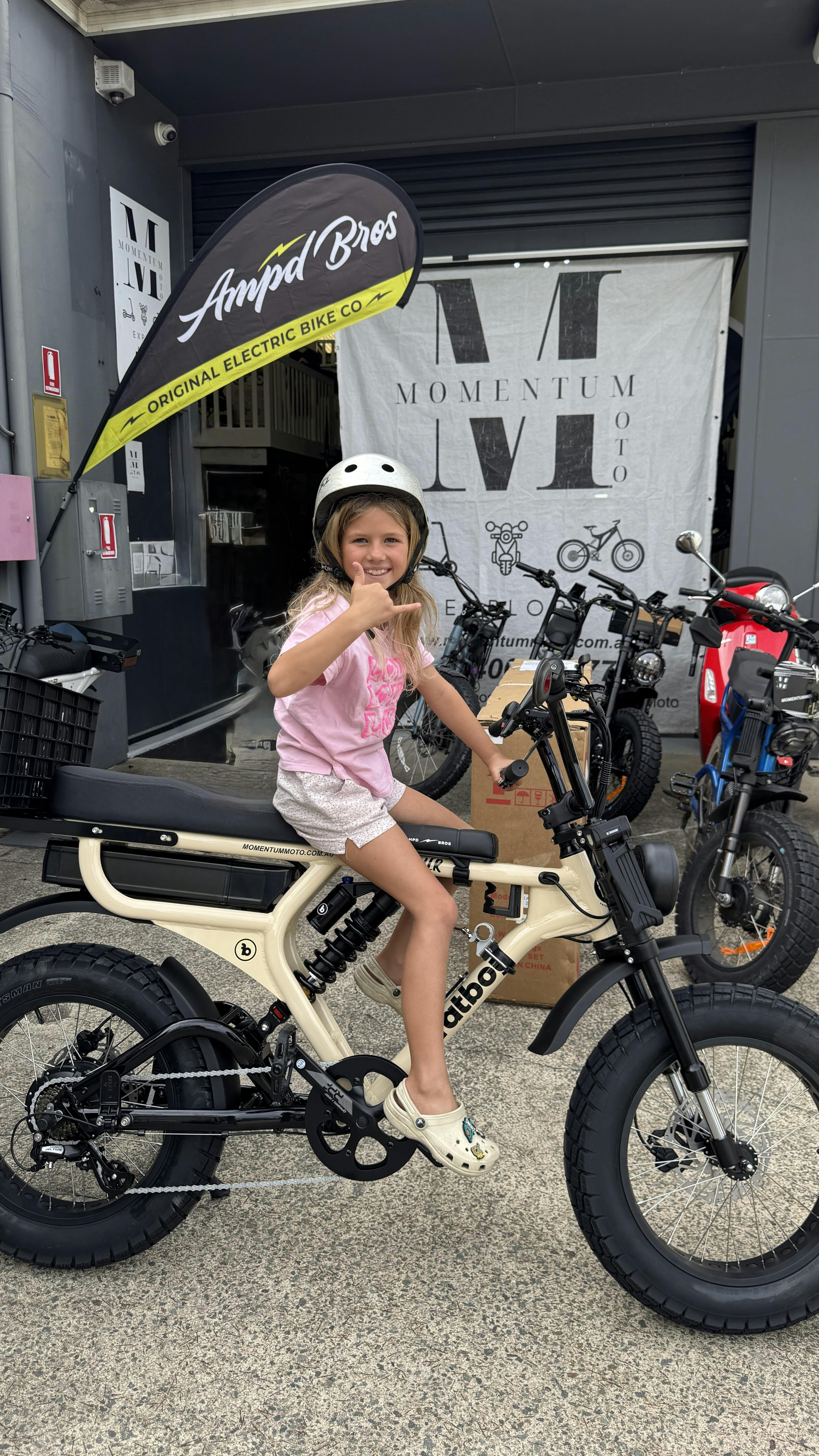 What an epic bike!! My daughter was the lucky winner of this e-bike kindly donated by Momentum Moto to the Noosa Tigers football club raffle. Ty was so helpful and knowledgeable. They installed a small kids seat at the front with handle bars & foot pegs so we can easily fit either myself or my husband and our two children (10 years & 7 years) We love the bike so much! Highly recommend Momentum Moto.